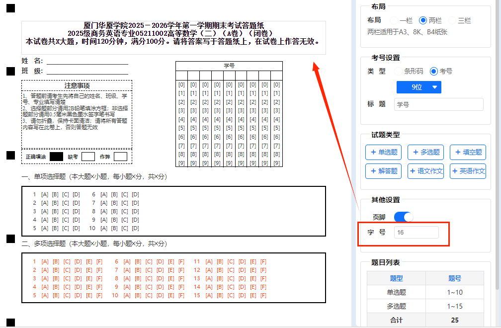 (1)答题纸样式需在该系统进行设置,导出打印后送文印中心复印。答题纸A3单面打印,四周的黑色定位点要印刷清晰,不能有明显折痕。
