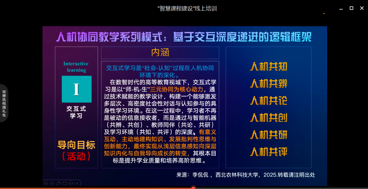 为积极响应国家教育数字化战略行动,推进人工智能技术与教育教学的深度融合,全面提升教师在智慧课程建设方面的专业能力与水平,我校于11月7日下午,通过腾讯会议平台,开展了一场主题为“价值引领、智慧赋能:数智时代专业课教师有效教学路径探索”的线上培训与指导,校级智慧课程负责人及团队成员参加培训。
