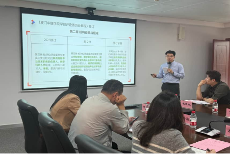 会上,唐维萍首先宣读了《厦门华厦学院关于调整学位评定委员会委员的通知》,介绍了校学位评定委员会委员调整情况。随后,教务处处长沈金海就《厦门华厦学院学位评定委员会章程》及《厦门华厦学院学士学位授予工作实施细则》的修订情况作了汇报。本次修订以《中华人民共和国学位法》为核心依据,重点在规范学位工作体制、优化工作流程与会议制度、完善学位授予质量保障机制等方面进行了系统调整。