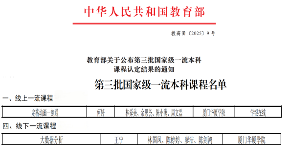 近日,教育部发布《教育部关于公布第三批国家级一流本科课程认定结果的通知》(教高函〔2025〕9号),我校两门课程成功入选。其中,《定格动画一刻通》被认定为国家级线上一流本科课程,《大数据分析》被认定为国家级线下一流本科课程。截至目前,学校已建成国家级一流线下课程两门、线上课程一门。