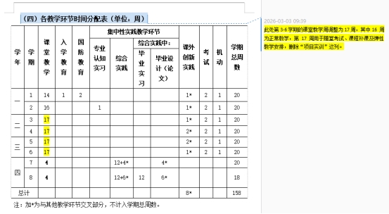 2.人才培养方案(附件 2),第九点“学分与学时分配”(四)各教学环节时间分配表(单位:周)应做如下调整:第3 - 6学期的课堂教学时间调整为17周,不再设置项目周课程。其中,1-16周为正常教学,第17周用于随堂考试、课程补课及弹性教学安排。